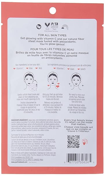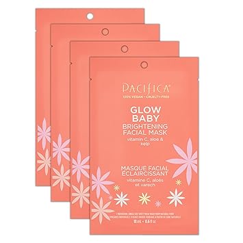 Pacifica Sheet Face Mask - Glow Baby Brightening Facial Mask w/Vitamin C, Aloe & Kelp - Cooling Mask for Dark Spots & Fine Lines - Clean Beauty Vegan & Cruelty-Free Dermatologist Tested