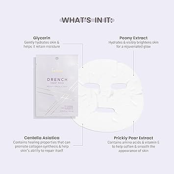 - Maintain Your Natural Glow - Infusing DRENCH vegan face mask sheets with Peony enriches it with Vitamin E & antioxidants. These powerful nutrients fortify each sheet face mask with enhancing properties that unveil your skin’s natural radiance from within.