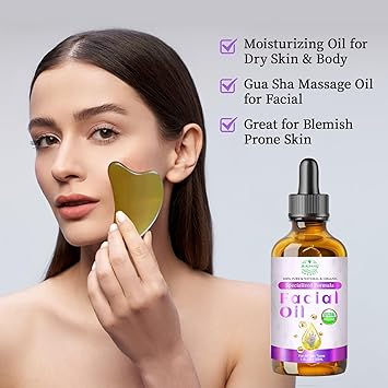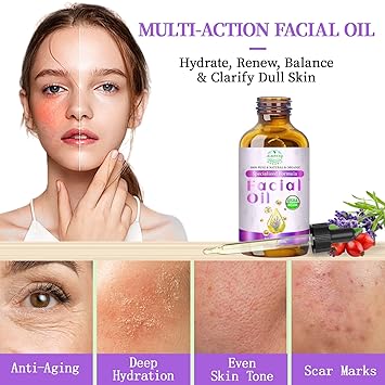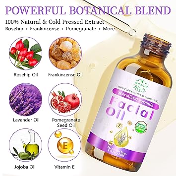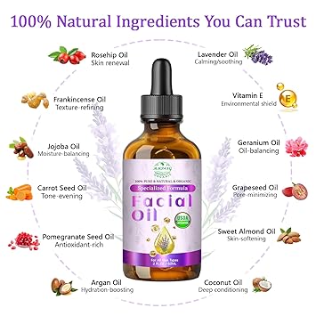 - Natural Blend Facial Oil: 100% Plant-Derived Actives & USDA Organic Certified Ingredients. Rosehip Oil, Jojoba Oil, Frankincense Oil, Lavender Oil, Carrot Seed Oil, Pomegranate Seed Oil, Geranium Oil, Grape Seed Oil, Sweet Almond Oil, Argan Oil, Coconut Oil, Vitamin E. This lightweight blend delivers essential fatty acids (omega 3/6/9), vitamins A/C/E, and antioxidants to nourish skin’s barrier, improve texture, and promote a healthy-looking complexion without clogging pores.