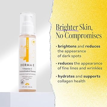 - VITAMIN C SERUM: Derma E Vitamin C hyaluronic acid serum for face is a brightening serum that supports collagen health and improves the appearance of skin. This dermatologist-recommended dark spot serum helps diminish the appearance of fine lines, wrinkles, and uneven skin tone