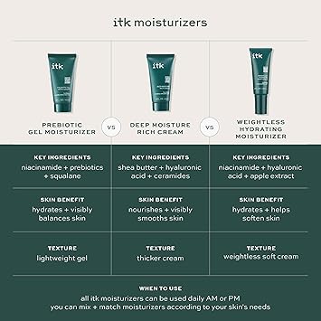 Experience the ultimate hydration with ITK Skincare Weightless Hydrating Face Moisturizer. This luxurious cream is specially formulated to provide intense moisture and smoothness to your skin, leaving it looking radiant and glowing. Infused with powerful ingredients like niacinamide, hyaluronic acid, and vitamin E, this vegan-friendly face cream works wonders in maintaining optimal moisture levels for a healthy complexion. Its unique formula also helps brighten dark spots for a more even skin tone. Trust in the confidence of ITK Skincare's commitment to quality skincare products with their Weightless Hydrating Face Moisturizer - perfect for any skincare routine!