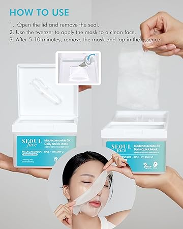 - SIMPLE USAGE INSTRUCTIONS: Designed for ease of use and maintaining hygiene, the packaging includes built-in tongs for picking up each mask. Simply cleanse your face, apply toner, use the tongs to place the mask evenly on your face, and leave it on for 5-15 minutes based on your skin’s absorption. After removal, gently pat the remaining essence into the skin for maximum benefits.