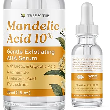 Tree To Tub Mandelic Acid Serum - 10% Gentle Exfoliating AHA Serum w/Lactic & Glycolic Acid for Smoother Skin - Hyaluronic Acid to Hydrate - Vegan Skincare for Men & Women