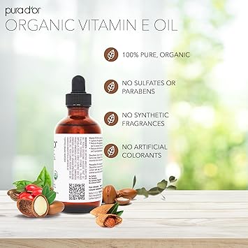 PURA D'OR 4 Oz Organic Vitamin E Oil - USDA Certified Face, Body, Hair & Bath Oil with Argan, Jojoba, Rosehip, Apricot, Almond & Avocado - Lightweight Moisturizing Blend for Soft, Smooth Skin