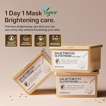 - GALACTOMYCES GLUTATHIONE DAILY MASK : This daily face sheet mask offers a tone-up effect through the combined action of Glutathione and Vitamin C. With 8 types of hyaluronic acid, this korean sheet mask efficiently replenishes moisture, catering to the demands of a hectic daily routine. Moreover, it is EVE VEGAN certified
