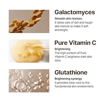 - KEY INGREDIENTS : Galactomyces and pure Vitamin C are both powerful skincare ingredients that can improve skin texture, brighten the complexion, and protect against environmental stressors. Galactomyces can enhance skin hydration levels, while pure Vitamin C can promote collagen synthesis for a firmer, smoother complexion and protect against UV damage