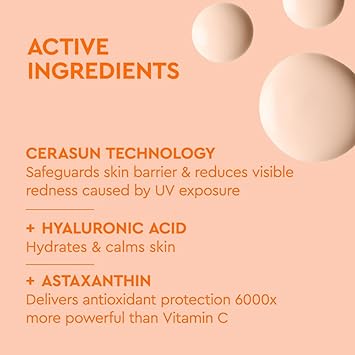 Formulated with CERASUN TECHNOLOGY to restore the skin barrier while alleviating redness caused by UV exposure. HYALURONIC ACID soothes and calms irritation while ASTHAXANTHIN (which naturally tints the formula pink) delivers antioxidant protection 6000x more powerful than Vitamin C and helps to brighten the skin.