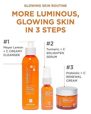 **Andalou Naturals Turmeric C Enlighten Serum for Brighter Skin** Achieve a more vibrant and luminous complexion with Andalou Naturals Turmeric C Enlighten Serum. This powerful serum targets uneven skin tone, dark spots, and signs of aging, leaving your skin looking smoother and more youthful. Infused with Fruit Stem Cell Science and a blend of turmeric and skin-friendly vitamin C, this serum promotes healthy skin, providing enzymatic support for dermal vitality and leaving your complexion with a more radiant, luminous glow. After cleansing your face and neck, gently apply a small amount of serum, massaging and patting it into the skin. For optimal results, follow with a moisturizer. At Andalou Naturals, we want you to feel empowered and confident in yourself, especially when it comes to what you put on your skin. That's why we infuse Fruit Stem Cell Science with unique and innovative ingredients to provide skincare solutions that target your skincare concerns and support healthy skin. Our products feature only ingredients that are gluten-free, sustainable, cruelty-free, and nature-derived. Non-GMO remains a core brand value of Andalou Naturals, and we continue to source superior non-GMO ingredients for our products.