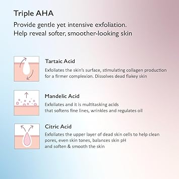 - TRIPLE AHA: Triple AHA for triple glow, exfoliate your skin thanks to citric acid, tartaric acid, and mandelic acid. all while maintaining a healthy pH and hydrated skin barrier.