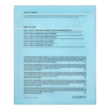 This skincare kit has all of your favorite Holy Hydration necessities in convenient travel sizes. The Hydrated Ever After Skincare Minis include a Holy Hydration. Daily Cleanser, Holy Hydration. Makeup Melting Cleansing Balm, Hydrating Booster Drops, Holy Hydration. Face Cream and Eye Cream.