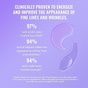 Formulated with the best ingredients to energize, firm, and depuff for brighter, more youthful-looking eyes. Our patches contain caffeine (1%) and acetyl tetrapeptide-5 to reduce signs of puffiness and swelling by decreasing fluid accumulation. Licorice extract, peptides, and aloe vera work to brighten dark circles and plump the appearance of fine lines and wrinkles. Niacinamide helps to soften signs of aging and improve visible skin tone while aloe leaf juice soothes and hydrates. Hyaluronic acid boosts moisture and can reduce the appearance of fine lines. Hydrogel technology delivers moisturizing and firming ingredients into the delicate skin of the eye contour.
