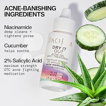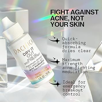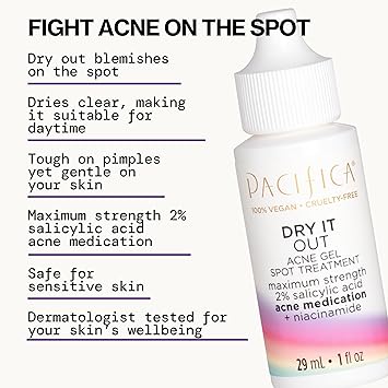 Banish Breakouts Fast with Pacifica Dry It Out Acne Spot Treatment Gel. Say goodbye to stubborn pimples and hello to clearer skin with this maximum strength acne fighter. Formulated with 2% Salicylic Acid (the highest level allowed in over-the-counter acne treatments), this targeted gel works quickly to dry out blemishes and reduce redness, so you can wake up to a calmer, clearer complexion.