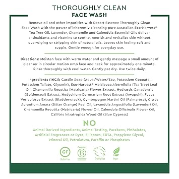 - Organic Formula - Desert Essence Thoroughly Clean Face Wash features an organic formulation crafted from natural ingredients, providing an eco-friendly skincare solution for oily and combination skin types.