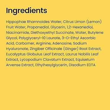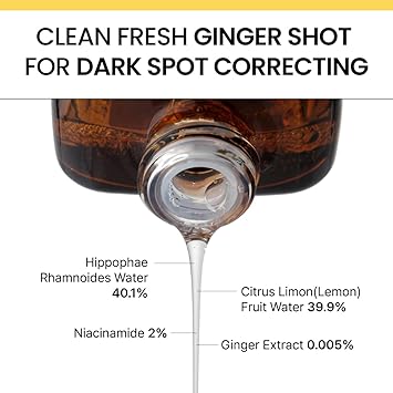 - 🫚 CLEAN FRESH GINGER SHOT Contains Hippophae Rhamnoides Water (40.1%), Citrus Limon (Lemon) Fruit Water (39.9%), Niacinamide (2%) and Ginger extract(0.05%) delivering a potent vitamin C boost to visibly minimize the look of dark spots. These natural botanical waters absorb more smoothly than pure ascorbic acid, making them ideal for all skin types—even sensitive.