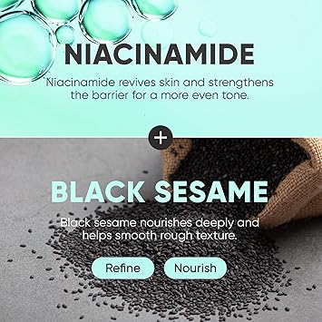 - MADE WITH SKIN-LOVING INGREDIENTS. Packed with the goodness of Sunflower Seed Oil, Rice Bran Extract, and Sesame Seed Powder, our bar soap helps moisturize, smooth texture, and support the skin barrier. Black Sesame softens dry patches and supports elasticity, while Niacinamide refines texture, reduces shine, and keeps skin nourished.