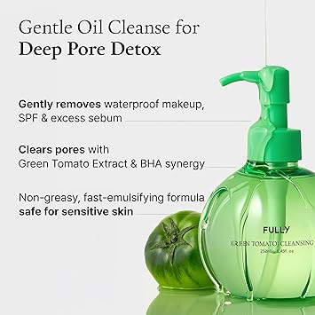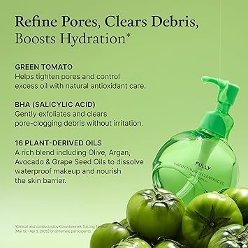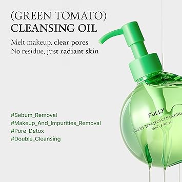 - SEBUM CARE & BLACKHEAD REMOVAL: Enriched with green tomato extract and BHA, FULLY Green Tomato Cleansing Oil melts away excess sebum, blackheads, and pore-clogging impurities in one step. The lightweight formula helps refine skin texture and promotes a visibly clearer complexion.