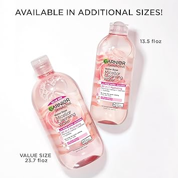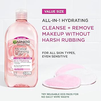 This all-in-1 hydrating Micellar Cleansing Water is a facial cleanser and makeup remover that is surprisingly powerful, yet gentle on skin. The Garnier Micellar Cleansing Water with Rose Water works for all skin types, effectively cleansing, removing makeup and hydrating skin. Like a magnet, micelles capture and lift away dirt, oil and makeup without harsh rubbing. This facial cleanser removes makeup, leaving skin perfectly clean without over drying. This Garnier Micellar Cleansing Water is gentle on skin and can be used to remove face makeup and eye makeup. Approved by Cruelty Free International, this formula is vegan and formulated without parabens, oils and dyes. Pour onto cotton pad until fully saturated. Gently wipe pad across face to cleanse and remove face makeup. To remove eye makeup, hold pad over closed eyelids for a few seconds, then gently wipe away. Use daily. No need to rinse. Try with our reusable Garnier Micellar Eco Pads.