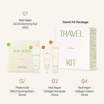 KLAVUU TRAVEL KIT - 4-Step Korean Skincare Set with Collagen Ampoule, Cream, Cleansing Pads & Foam | Travel Size Gift Set | Vegan | Mini K-Beauty Trial Kit