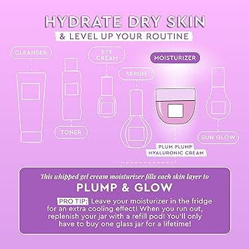 - Plump & Balance Your Skin - Introducing your new favorite daily facial moisturizer in its first-of-its-kind refillable jar. Glow Recipe's Plum Plump hyaluronic acid Korean moisturizer gives each layer of skin intense, juicy hydration. Its gel-cream texture is quick-absorbing and non-greasy, revealing a dewy complexion and youthful appearance.