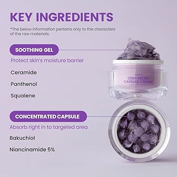 - INNOVATIVE CAPSULE FORMULA FOR TROUBLE-PRONE SKIN Innovative capsule cream effectively targets troubled areas. Concentrated capsule contains BAKUCHIOL and 5% NIACINAMIDE. Soothing gel protects the barrier with CERAMIDE & PANTHENOL.