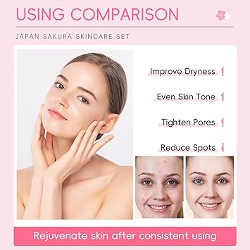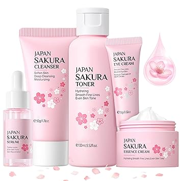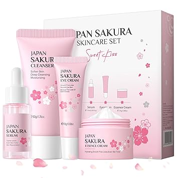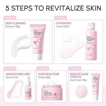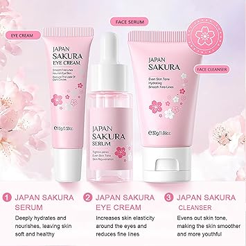 - 【Clean & Moisturizing】Perfect travel set. First, cleanse your face with Sakura Facial Cleanser. Next, apply toners, serums, and creams to moisturize dry skin. Finally, use an eye cream to reduce dark circles. This is the ideal gift to keep your skin clear and youthful.
