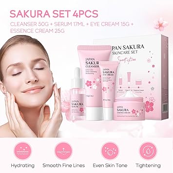 - 【JAPAN SAKURA Skin Care Set】This set contains skin care essentials: facial cleanser, facial serum, face cream and eye cream. The entire care set can effectively improve dull and dry skin in all aspects, reduce wrinkles and spots, tighten skin, shrink pores, and keep skin moist, plump, and shiny for a long time.