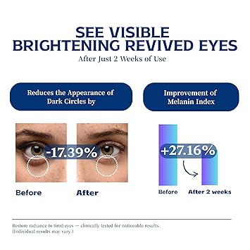 - Brightening & Revitalizing Power Niacinamide and Caffeine visibly brighten dull skin, reduce dark circles, and refresh tired eyes for a more awakened appearance.