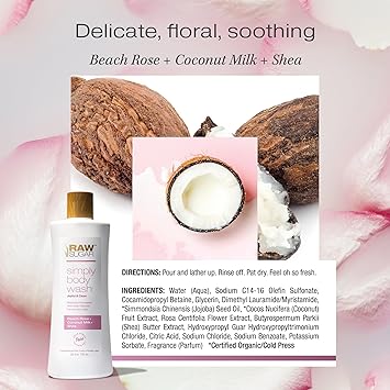 RAW SUGAR Simply Body Wash, Beach Rose + Coconut Milk + Shea (25 Fl Oz, Pack of 1) Sensitive Skin Bath Soap, Formulated without Sulfates & Parabens