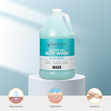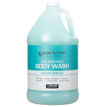 Ginger Lily Farms Club & Fitness Ocean Breeze Nourishing Body Wash gently and effectively washes away dirt, oil and bacteria with a silky smooth lather that leaves skin soft, nourished and free of harsh chemicals. Rich, creamy formula is enriched with naturally derived botanicals to soften, smooth and reinvigorate skin. Features a soothing Ocean Breeze scent that will leave you feeling refreshed. Perfect for washing away sweat and odor after working out. Easily lathers on the skin to wash away dirt, oil and bacteria. Toxin-free formula contains no harsh chemicals like parabens, sulfates, phosphates or gluten and is gentle enough for even the most sensitive skin. Ginger Lily Farms Club & Fitness Nourishing Body Wash is 100% vegan, cruelty-free and PETA certified so you can feel good while using it. Commercial refill size is perfect for fitness centers, locker rooms, gyms and health clubs.