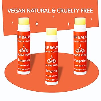 - ALIDA PURE Tangerine Lip Balm Collection is made with cruelty free, hypoallergenic, organic, and natural oils, that protect, and soothe. The refreshing Tangerine Lip Balm Collection, includes three Tangerine .15-ounce, lip balms.Thoughtfully packaged with biodegradable materials that support the environment.