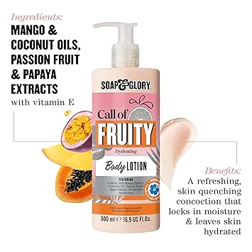 Soap & Glory Call of Fruity Vegan Body Lotion - Moisturizing Body Lotion with Vitamin E, Coconut Oil & Aloe Extracts - Tropical Fruits, Juicy Melon & Hibiscus Cocoa Butter for Dehydrated Skin (500ml)