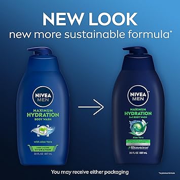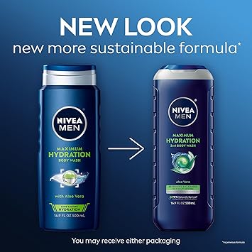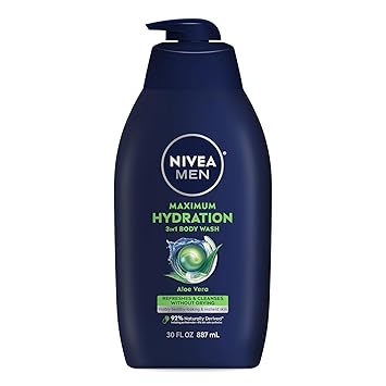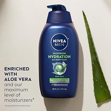 Experience long-lasting hydration right out of the shower with NIVEA MEN Maximum Hydration Body Wash. This mens body wash for dry skin is enriched with Aloe Vera and our maximum level of moisturizers (amongst NIVEA MEN Body Wash line) to refresh and cleanse the skin and leave it feeling hydrated and comfortable. The 3-in-1 shower gel can be used as a body wash, face wash and shampoo. With a long-lasting citrus and woody amber scent, this body cleanser creates a modern, masculine fragrance, leaving you feeling fresh long after the shower. Plus, it has a vegan formula (animal-derived ingredients) that is free from microplastic particles, parabens, phthalates and dyes. This paraben free body wash is formulated with 92% naturally derived ingredients* and a 99% biodegradable formula**, plus it's packaged in a bottle made from 96% recycled plastic***, reflecting NIVEA's commitment to sustainability. Complete your men's skin care routine by pairing it with the NIVEA MEN Maximum Hydration range. *Naturally derived ingredients, including purified water, have undergone processing while retaining a majority of their natural molecular structure. 8% skin safe synthetics are included to maintain the integrity of the formula. **as per OECD or equivalent methods ***excluding label