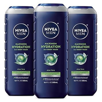 Nivea Men Maximum Hydration Body Wash for Dry Skin, Aloe Vera Enriched, 3-in-1 Moisturizing Body Wash, Face and Hair, Paraben Free, Vegan Formula, 16.9 Fl Oz Bottle, Pack of 3