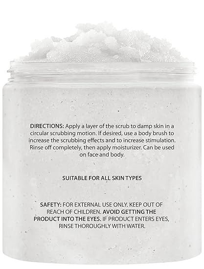 - SUITABLE FOR ALL SKIN TYPES - Our exfoliating body scrub is recommended for oily skin, dry skin, and everything in between. Get healthy, glowing skin with this spa quality gentle exfoliating and moisturizing body scrub and hand scrub! Apply it to moistened skin and massage gently with your fingertips in a circular motion for around 5 minutes. Rinse thoroughly and pat dry.