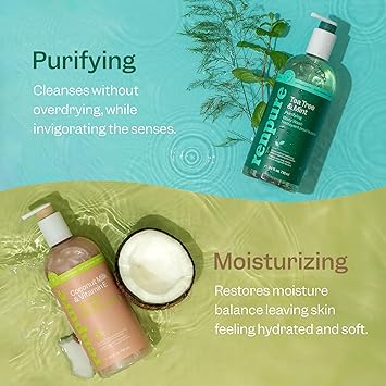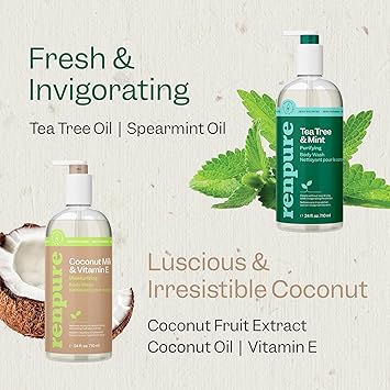 Renpure Tea Tree & Mint Purifying Body Wash cleanses and refreshes skin without over-drying while invigorating the senses. Renpure Coconut Milk & Vitamin E Body Wash moisturizes and cleanses the skin, leaving it feeling soft and refreshed. Our naturally inspired body washes are ideal for all skin types. Our bottles are made from 100% post-consumer recycled plastic for an eco-friendly skincare solution.