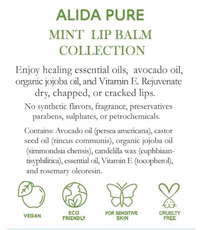 ALIDA PURE Mint Lip Balm Collection, Vegan Lip Balm, Beeswax Free, with Avocado Oil, Organic Jojoba Oil, and Vitamin E, for Dry, Chapped, or Cracked Lips, 3 Tube Set