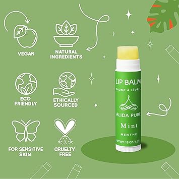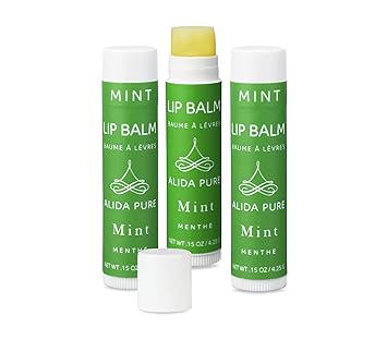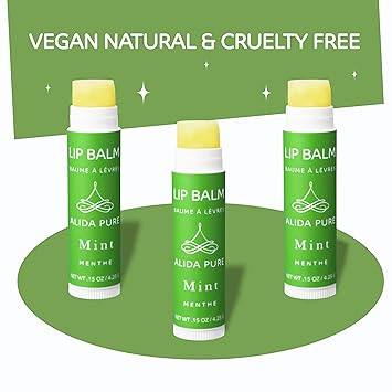 ALIDA PURE Mint Lip Balm Collection. 100% Natural Vegan, Lip Balm | Lip Gloss. ALIDA PURE nourishing lip balm, 100% beeswax free, coconut oil free, cruelty free, mineral oil free, paraben free, natural, lip repair, lip treatment. Enjoy smooth, skin softening, rich, and creamy vegan, lip balm in cool and minty Mint. This moisturizing, ultra-conditioning, soothing, natural lip balm, lip oil, will protect and hydrate your lips all day long! Loaded with skin rejuvenating, high oleic, and healing, natural oils: avocado oil (persea Americana), organic castor seed oil (rincus communis), organic jojoba oil (simmondsia chensis), candelilla wax (euphbiaantisyphiltica), Vitamin E (tocopherol), organic mint essential oil, and rosemary oleoresin. No bees wax, animal testing, synthetic flavors or fragrances, gluten, parabens, sulphates, soy, or petroleum products. For best results apply ALIDA PURE Lip Balm generously to your lips every few hours for moisturizing lip care. The ALIDA PURE Mint Lip Balm Collection includes five tubes of Mint Lip Balm. Each stick of vegan lip balm contains .15 ounce of lip balm.