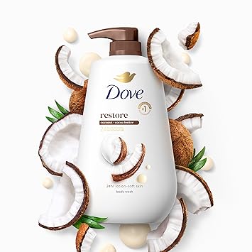 Dove Body Wash with Pump Restore Coconut & Cocoa Butter for 24hr Lotion-Soft Skin Moisturizing Skin Cleanser with No Sulfates No Parabens 30.6 Oz