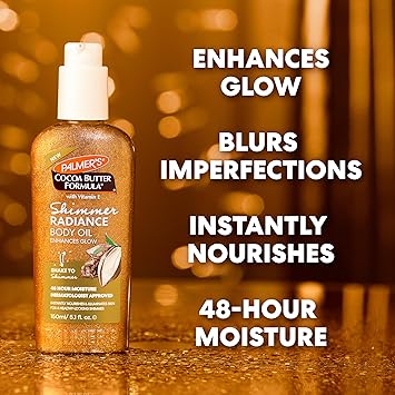 Palmer's Cocoa Butter Formula Shimmer Radiance Body OilStep into the spotlight with Palmer's Shimmering Radiance Body Oil, your new go-to body shimmer oil. This deeply nourishing body oil is perfect for creating radiant, glowing skin. Formulated with Cocoa Butter and Vitamin E, it provides a boost in hydration while giving an overall glow. This body oil amplifies your skin's deep and rich tonality, enhancing dark tones and tans.Use our dermatologist approved glow oil as a body oil after a shower, for a healthy-looking shimmer. Simply shake and apply for a boost in hydration and overall glow. This shimmering body oil is cruelty-free, vegan friendly and free from Mineral oil, Phthalates, Dyes and Parabens.Palmer's has been a trusted brand for over 180 years, providing high-quality natural products that are passed down from generation to generation. Whether you're looking for a cocoa radiant body oil, or simply a shimmering body oil to enhance your tan, this product has it all. Use Palmer's glow body oil and enjoy 48-hours of moisture, with skin that shimmers and glows like never before. Great for flaunting summer skin, holiday events, nights out or vacation ready moments!
