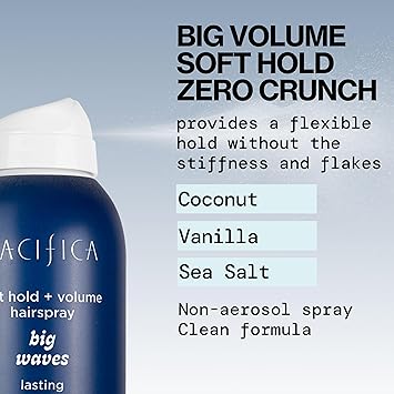 - FLEXIBLE ALL-DAY HOLD, ZERO CRUNCH Experience the ultimate lightweight, non aerosol hold with our Pacifica Coconut Sea Salt Vanilla Hairspray. This non toxic, natural hairspray for women delivers a soft, flexible hold that lasts all day without any crunchy residue or flaking. Infused with sea salt and a hint of coconut vanilla, it creates a beach hair spray effect that enhances volume, texture, and natural movement—perfect for fine, curly, or wavy hair styling.