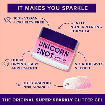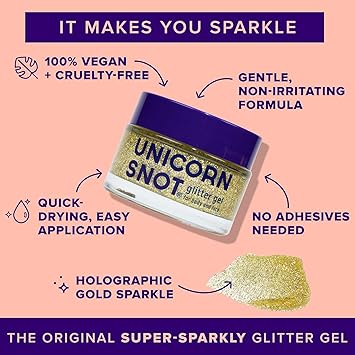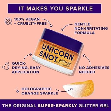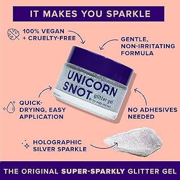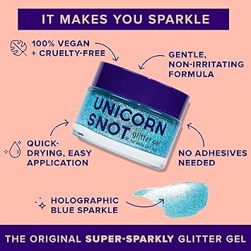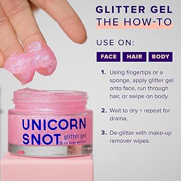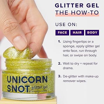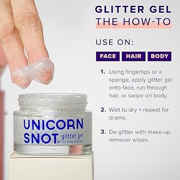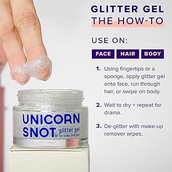 - NO HARMFUL CHEMICALS: Unlike other glitter gel bases which can contain unhealthy chemicals that absorb into your skin, Unicorn Snot Glitter Gel is made with cosmetic-grade glitter, so it’s safe for your skin and safe for your kids. It dries quickly, lasts all day, and removes easily.