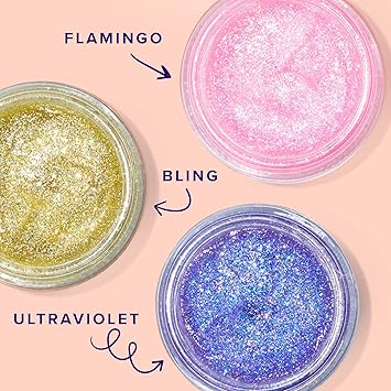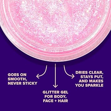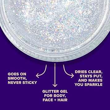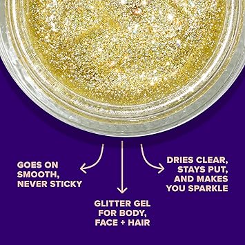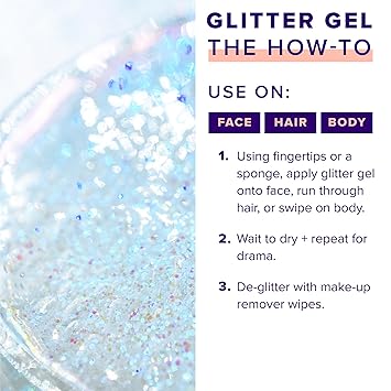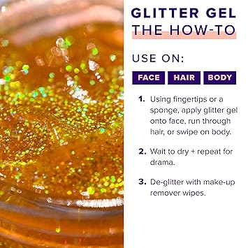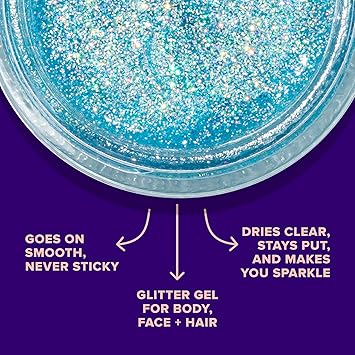 - SPARKLE ON THE GO: This glitter gel is the perfect glitter makeup for your body, head to toe: face, eyeshadow, cheeks, lips, and hair! Be wild and prepare for festivals, clubs, parties, raves, costumes, themed parties, Halloween, and more. This shimmer takes hair and make-up to another level. Mix and match your favorite colors.