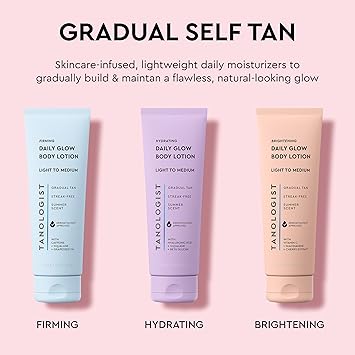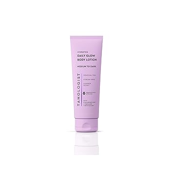 The Tanologist Hydrating Daily Glow Body Lotion is a gradual tanning lotion that helps to moisturize and nourish skin while also leaving you with a natural, sun-kissed glow. This innovative self-tanner lotion provides a gradual, streak-free bronze without the self-tan smell. With a light summer scent and fast absorbing, lightweight texture, it's perfect for daily use. The daily moisturizer is infused with hydrating ingredients such as hyaluronic acid, squalane and beta glucan to deeply nourish the skin. For a natural glow all year round, use this has your daily body lotion. The color will build gradually with daily application. Dermatologist tested and approved, the Daily Glow Lotion is suitable for all skin types and tones. At Tanologist we believe in the universal power of glow, so we created clear, game changing, dermatologist approved self-tan innovations that are affordable and allow consumers to create their glow, in their shade, their way. Available in four customizable shades and a range of formats powered by skin-loving, derm approved formulas, Tanologist is guaranteed to work for all skin types and tones.