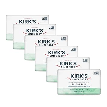 Kirk's Castile Bar Soap for Men, Women & Children - Made with Premium Coconut Oil, Sensitive Skin Formula, Vegan, Non GMO, Aloe Vera, 4 oz. Bars 6 Pack