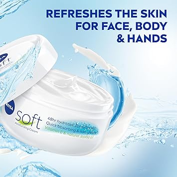 For soft, beautiful skin count on NIVEA Soft Refreshingly Soft Moisturizing Cream. NIVEA Soft is an all-in-one refreshing face cream, body cream and hand cream that delivers 48-hour hydration for soft, supple skin. This body cream moisturizer is vegan(1) and the refreshingly light formula is enriched with Jojoba Oil and Vitamin E for softer, smoother skin without that greasy feel. This fast-absorbing body moisturizer is suitable for all skin types. NIVEA Soft cream gives dry skin on the body, face and hands the refreshing, hydrating skincare it deserves. To use, smooth this dry skin moisturizer onto your skin daily. For the best results, apply this dry skin cream after showering and on hands after washing them. NIVEA is proud to be one of the leading companies in the field of skin care products, with more than 130 years of expertise. (1)no animal derived ingredients (2)vs. previous formula (3)naturally derived ingredients have undergone processing while retaining the majority of their natural molecular structure (4)skin safe synthetic ingredients are included to maintain the integrity of the product (Myristyl Alcohol, Tocopheryl Acetate, Sodium Hydroxide, Phenoxyethanol, Fragrance)