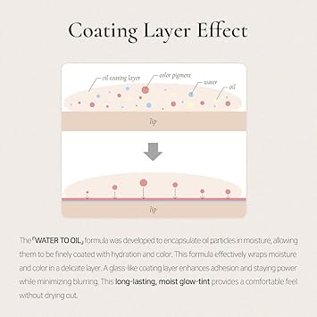- [COATING LAYER EFFECT FOR LONG-LASTING SHINE & MOISTURE] Features a ‘Water-to-Oil’ formula that wraps lips in a moisture-rich color veil. Glass bead coating enhances color adhesion and shine while minimizing smudging and dryness for a soft, glossy finish that lasts.