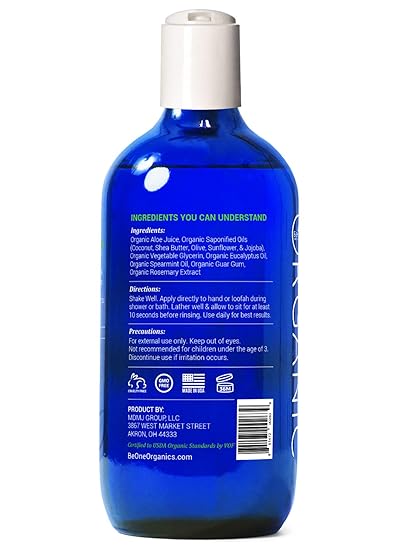 Certified Organic Spearmint & Eucalyptus Body Wash by Be-One - Paraben & Sulfate Free - Vegan - All Natural - Eczema - Sensitive Skin - For Men & Women - MADE IN USA