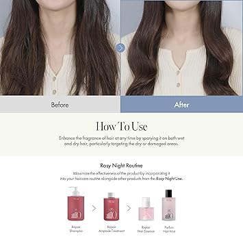 - Korean Hair Mist - Long-Lasting Hair Perfume Mist - A refreshing water-based hair mist infused with Damask Rose & Rosehip Oil to add a luxurious, musky floral scent that lingers all day. Perfect for all hair types.