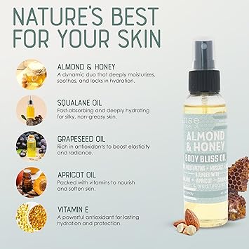 Rinse Bath & Body Almond & Honey Body Oil Moisturizer Spray - Natural, Light & Fast Absorbing | Squalane, Grapeseed & Apricot Oil | All Skin Types | Shower & Massage | Vitamin E | Handmade | 4floz