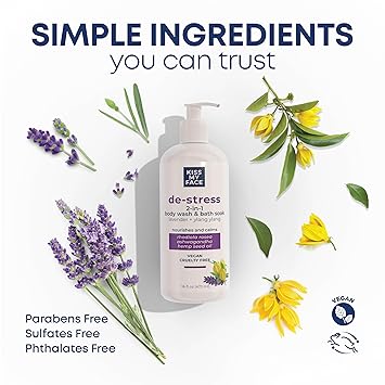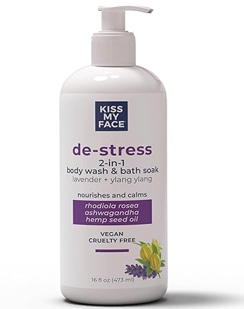 Kiss My Face De-Stress 2-in-1 Body Wash & Bath Soak Lavender + Ylang Ylang - Vegan Body Wash - 16 oz Bottle with Pump (Lavender & Ylang Ylang, Pack of 1)